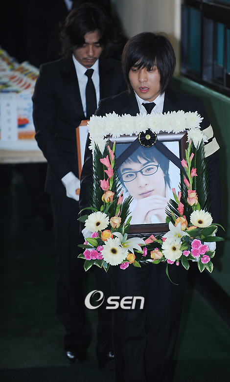 지난달 29일 오전 불의의 오토바이 사고로 사망한 그룹 '먼데이키즈' 멤버 김민수(23)의 발인이 1일 오전 11시 서울시 동작구 신대방동 서울시립보라매병원 장례식장에서 가족 친지 및 동료들의 오열 속에 진행됐다. 같은 먼데이키즈의 멤버 이진성이 슬픈 표정으로 영정을 들고 나오고 있고, 같은 소속사 가수인 일락이 그 뒤를 따르고 있다. /민경훈 기자 rumi@osen.co.kr