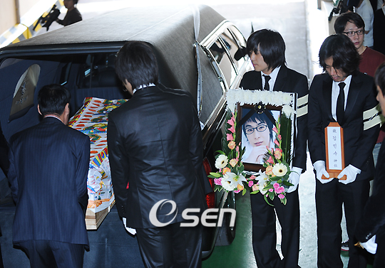 지난달 29일 오전 불의의 오토바이 사고로 사망한 그룹 '먼데이키즈' 멤버 김민수(23)의 발인이 1일 오전 11시 서울시 동작구 신대방동 서울시립보라매병원 장례식장에서 가족 친지 및 동료들의 오열 속에 진행됐다. 같은 먼데이키즈의 멤버 이진성과 같은 소속사 가수인 일락곁에서 김민수의 관이 차로 옮겨지고 있다. /민경훈 기자 rumi@osen.co.kr