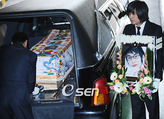 지난달 29일 오전 불의의 오토바이 사고로 사망한 그룹 '먼데이키즈' 멤버 김민수(23)의 발인이 1일 오전 11시 서울시 동작구 신대방동 서울시립보라매병원 장례식장에서 가족 친지 및 동료들의 오열 속에 진행됐다. 김민수의 관이 차로 옮겨지고 있을때 같은 먼데이키즈의 멤버 이진성이 곁에서 눈을 감은채 묵념을 하고 있다. /민경훈 기자 rumi@osen.co.kr