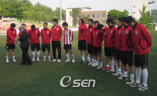 김상훈 고려대 감독과 신재흠 연세대 감독이 U리그가 선수들에게 프로의 생리를 배울 수 있는 계기가 되었으면 좋겠다는 바람을 드러냈다. 1일 오후 3시 서울 고려대 녹지운동장에서 열린 U리그 개막전 연세대와 고려대의 대결은 2-2 무승부로 끝났다. 경기가 끝난 후 가진 공식 기자회견에서 홈팀 고려대 김상훈 감독은 "준비를 많이 했는데 무승부로 끝나서 아쉽다"는 소감을 밝혔다. 이어 그는 "후반 28분 이용의 추가골이 오프사이드로 판정된 것이 이해가 가지 않는다"고 말했다. 그러나 U리그에 대해서는 큰 만족감을 드러냈다. 김 감독은 "U리그는 축구 선수들과 일반 학생이 같이 호흡할 수 있는 여유가 있다"며 "앞으로도 이런 모습이 계속 이어졌으면 한다"고 말했다. 또 내년부터 전국으로 확대되는 부분에 대해서는 "빨리 U리그가 확대되야 한다고 생각한다"며 "선수들의 경기력 향상도 향상이지만, 프로 스타일에 익숙해지면서 프로에 대한 적응력이 많이 높아질 것"이라고 설명했다. 한편 원정팀 연세대 신재흠 감독은 "큰 사고 없이 경기를 치러서 만족한다"고 말했다. 신 감독도 U리그에 대해 "아마추어 선수들에게는 프로에서 더 잘할 수 있는 바탕이 될 것"이라며 "선수 개인에게 오늘 경기가 끝난 후 몸 상태를 준비할 수 있는 방법을 배우는 학습의 장이 될 것"이라고 강조했다. stylelomo@osen.co.kr 경기가 끝난 후 고려대 선수단이 현승종 고려대 이사장과 악수를 나누고 있다.