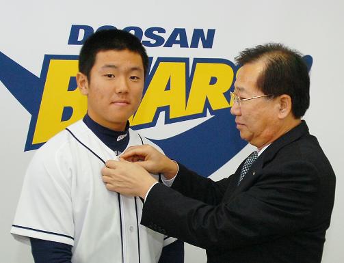 두산 베어스와 LG 트윈스가 예비 새내기들의 활약에 미소를 감추지 못하고 있다. 황금사자기 고교야구 대회 준우승을 이끈 뒤 지난 달 1일 두산의 1차 지명을 받고 계약금 5억 5000만 원에 입단 계약을 체결한 덕수고 에이스 성영훈(18)은 지난 2일 목동구장에서 열린 대통령배 고교야구 대회 4강전 서울고와의 경기에 등판, 8⅓이닝 동안 노히트 노런으로 상대 타선을 잠재우며 팀의 7-1 승리를 견인했다. 0-1로 뒤진 1회 2사 2,3루 실점 위기에서 마운드에 오른 성영훈은 선두 타자 김동빈을 삼진으로 잡아낸 뒤 9회까지 26명의 타자와 상대해 10탈삼진을 기록했다. 체격 조건(181cm 90kg)이 좋고 150km대의 광속구를 뿌리는 성영훈은 고교 무대 투수 가운데 최대어로 손꼽히며 프로 구단과 메이저리그 스카우트의 뜨거운 관심을 받았다. LG에 1차 지명된 뒤 계약금 2억 8000만 원에 입단 계약을 체결한 경기고 오지환(18)은 팀의 에이스 겸 간판 타자. 우수한 체격 조건(186cm 80Kg)과 뛰어난 타격 재능(우투좌타), 안정된 수비력을 두루 갖춘 대형 내야수 오지환은 투수로 나서 시속 145km에 이르는 빠른 공을 던질 만큼 투타에서 뛰어난 재능을 드러냈다. 오지환은 1일 경북고와의 8강전서 투타 원맨쇼를 펼쳤다. 마운드에서 9이닝 9피안타 6탈삼진 3실점을 기록하며 완투승을 따냈고 공격에서는 6회 우월 솔로 아치를 쏘아 올리는 등 4타수 2안타 2타점 1득점으로 팀의 4-3 역전승을 이끌었다. 이어 2일 배명고와의 4강전에서도 투타에서 인상적인 활약을 펼치며 4-1 승리를 장식했다. 한편 덕수고와 경기고는 3일 오후 1시부터 목동구장에서 결승전을 펼친다. what@osen.co.kr 성영훈의 두산 입단식 장면.