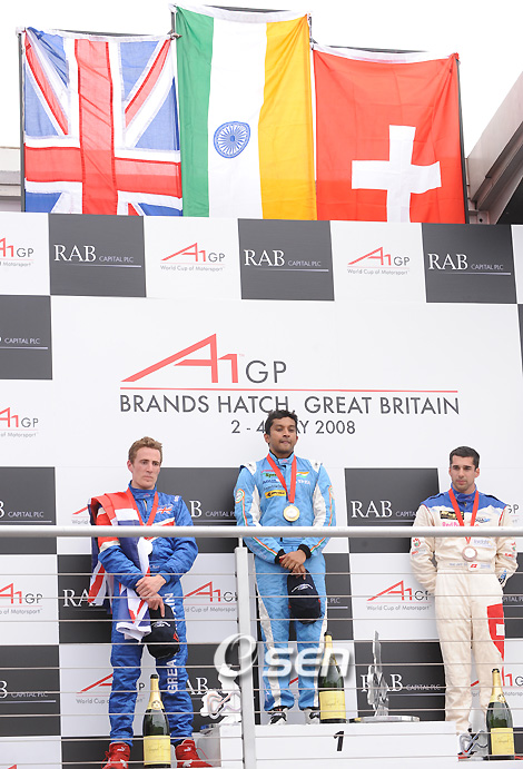 전 세계 25개국만이 참가할수 있는 국가 대항 모터 스포츠카 월드컵 A1GP 경기에 한국의 (주)굿이엠지(대표이사:이혁수)의 자회사인 (주)옴니버스파트너(대표이사:김정용)는 지난 13일 중국 상하이에서 조인식을 갖고, A1 Team Korea의 권리를 획득 2008/9 시즌부터 A1GP에 참가한다. 5일(한국시간) 영국 켄트 브랜즈해치에서 열린 A1GP 2007/8 시즌 피쳐 레이스 경기에서 인도의 나레인 카티케얀이 마지막 라운드피쳐 에서 우승했다. 시상대에서 왼쪽부터 2위 로비 커(영국), 1위 나레인 카티케얀(인도),3위 닐 자니(스위스) 등이 국가 연주를 듣고 있다./영국=김영민 기자ajyoung@osen.co.kr