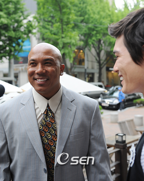 한국계 미식축구 스타 하인스 워드(32)가 SBS TV 인기 수목드라마 '온에어'의 마지막 거물 카메오로 출연한다. 7일 오후 서울 강남구 신사동의 한 카페에서 진행된 촬영에서 워드는 극중 인물 에이든 리(리키 김)와 2년 뒤 서울에서 재회하는 설정으로 카메라 앞에 섰다. 에이든은 그 사이 대스타로 성장했고 워드와 에이든은 전부터 서로 아는 사이다. 이날 촬영분은 마지막 21회(15일)에서 방송된다. 하인스 워드가 촬영장에 도착해 리키 김과 얘기를 나누며 웃고 있다./민경훈 기자 rumi@osen.co.kr