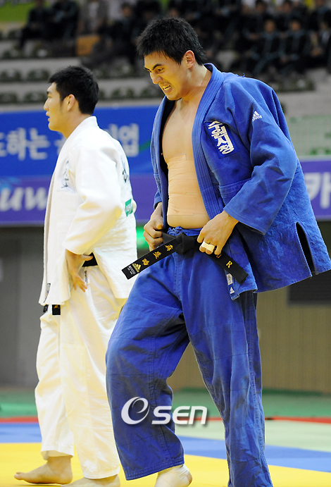 '2008 베이징올림픽 최종선발전 및 제 47회 전국 체급별 남,녀 유도선수권 대회'가 8일 수원 실내체육관에서 벌어졌다. -100kg급 1회전서 얼짱 아테네올림픽 은메달리스트 장성호(수원시청, 청색)가 이성규(용인대)에게 한판승을 따내 2회전에 진출했다. 장성호가 경기 중 심판의 '그쳐' 선언에 가쁜 숨을 몰아쉬고 있다. /수원=황세준 기자 storkjoon@osen.co.kr