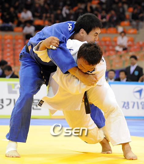 '2008 베이징올림픽 최종선발전 및 제 47회 전국 체급별 남,녀 유도선수권 대회'가 8일 수원 실내체육관에서 벌어졌다. -100kg급 결승전서 얼짱 아테네올림픽 은메달리스트 장성호(수원시청, 청색)가 김정훈(수원시청)에게 되치기 한판승으로 베이징 올림픽 출전권을 거머줬다. 김정훈이 장성호에게 업어치기를 시도하고 있다. /수원=황세준 기자 storkjoon@osen.co.kr