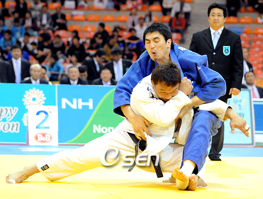 '2008 베이징올림픽 최종선발전 및 제 47회 전국 체급별 남,녀 유도선수권 대회'가 8일 수원 실내체육관에서 벌어졌다. -100kg급 최종결승 재경기까지 치러 얼짱 아테네올림픽 은메달리스트 장성호(수원시청, 청색)가 김정훈(수원시청)에게 되치기 한판승으로 베이징 올림픽 출전권을 거머줬다. 장성호가 김정훈에게 '효과'를 허용하고 있다. /수원=황세준 기자 storkjoon@osen.co.kr