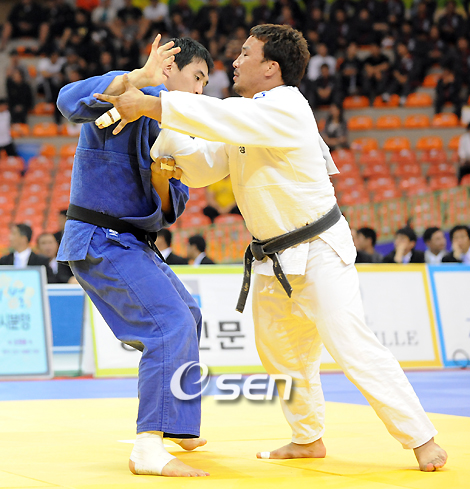 '2008 베이징올림픽 최종선발전 및 제 47회 전국 체급별 남,녀 유도선수권 대회'가 8일 수원 실내체육관에서 벌어졌다. -100kg급 최종결승서 얼짱 아테네올림픽 은메달리스트 장성호(수원시청, 청색)가 재경기까지 치른 끝에 김정훈(수원시청)에게 되치기 한판승으로 베이징 올림픽 출전권을 거머줬다. /수원=황세준 기자 storkjoon@osen.co.kr