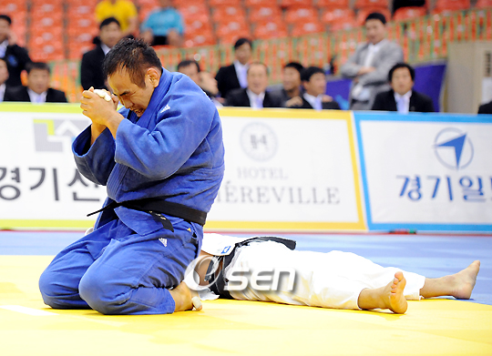 '2008 베이징올림픽 최종선발전 및 제 47회 전국 체급별 남,녀 유도선수권 대회'가 8일 수원 실내체육관에서 벌어졌다. -90kg급 결승전서 최선호(수원시청, 청색)가 황의태(수원시청)에게 경기 종료 직전 업어치기 한판승으로 베이징 올림픽 출전권을 거머줬다. 최선호가 승리를 거둔 뒤 기도하고 있다. /수원=황세준 기자 storkjoon@osen.co.kr