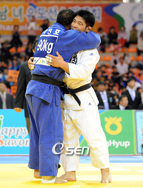 '2008 베이징올림픽 최종선발전 및 제 47회 전국 체급별 남,녀 유도선수권 대회'가 8일 수원 실내체육관에서 벌어졌다. -90kg급 결승전서 최선호(수원시청, 청색)가 황의태(수원시청)에게 경기 종료 직전 업어치기 한판승으로 생애 첫 올림픽 출전권을 거머줬다. 최선호와 황의태가 경기를 마치고 포옹하고 있다. /수원=황세준 기자 storkjoon@osen.co.kr