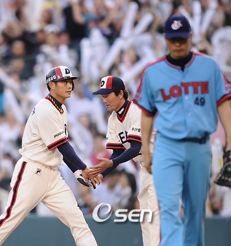 '2008 삼성 PAVV 프로야구' 두산 베어스와 롯데 자이언츠 경기가 11일 잠실구장에서 열렸다. 이날 경기는 플레이어스데이(PLAYER'S DAY)로 지정, 양 팀이 추억의 올드유니폼을 입고 경기를 가졌다. 두산 6회말 2사 만루 안경현이 내야땅볼을 치고도 롯데 박기혁 유격수가 가랑이사이로 빠트리는 행운으로 1루에 진루한 안경현이 1루 김민호 코치의 환영을 받고 있다./잠실=김영민 기자ajyoung@osen.co.kr