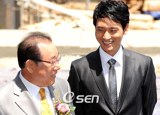 6월 16일 첫 방송 예정인 SBS TV 새 월화드라마 ‘식객’의 촬영현장 공개 행사가 15일 낮 강원도 정선군 강원랜드 내 운암정 신축공사 현장에서 열렸다. 드라마의 중요 촬영지이자 드라마 촬영 후에는 전문 한식점으로 사용될 ‘운암정’의 상량식을 거행하는 장면이었다. 운암정은 4260평방미터(1288평) 넓이의 부지에 주건물인 운암정을 비롯해 주방동 사무동 숙소동 팔각정 등이 들어서 건평만 1567평방미터(474평)에 이른다. 공사비만 약 40억 원이 들어간다. 이날 행사에는 최불암 권오중 김소연 원기준 김성겸 심양홍 등 주연배우들과 김진선 강원도지사, 강원랜드 임직원 등이 참석했다. 민우 역의 원기준과 윤 이사 역의 심양홍이 환하게 웃고 있다. /정선=강희수 기자 100c@osen.co.kr