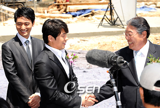 6월 16일 첫 방송 예정인 SBS TV 새 월화드라마 ‘식객’의 촬영현장 공개 행사가 15일 낮 강원도 정선군 강원랜드 내 운암정 신축공사 현장에서 열렸다. 드라마의 중요 촬영지이자 드라마 촬영 후에는 전문 한식점으로 사용될 ‘운암정’의 상량식을 거행하는 장면이었다. 운암정은 4260평방미터(1288평) 넓이의 부지에 주건물인 운암정을 비롯해 주방동 사무동 숙소동 팔각정 등이 들어서 건평만 1567평방미터(474평)에 이른다. 공사비만 약 40억 원이 들어간다. 이날 행사에는 최불암 권오중 김소연 원기준 김성겸 심양홍 등 주연배우들과 김진선 강원도지사, 강원랜드 임직원 등이 참석했다. 운암정 상량식에 참석한 장 회장 김성겸이 봉주(권오중)에게 악수를 청하고 있다. /정선=강희수 기자 100c@osen.co.kr