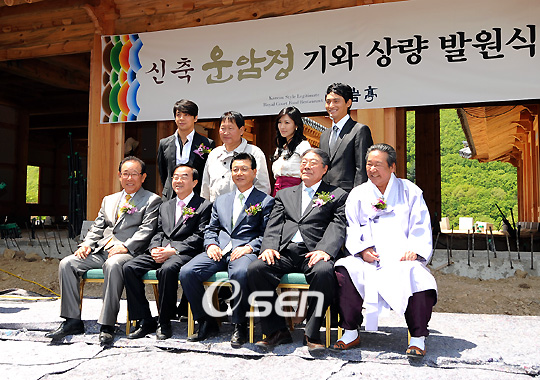 6월 16일 첫 방송 예정인 SBS TV 새 월화드라마 ‘식객’의 촬영현장 공개 행사가 15일 낮 강원도 정선군 강원랜드 내 운암정 신축공사 현장에서 열렸다. 드라마의 중요 촬영지이자 드라마 촬영 후에는 전문 한식점으로 사용될 ‘운암정’의 상량식을 거행하는 장면이었다. 운암정은 4260평방미터(1288평) 넓이의 부지에 주건물인 운암정을 비롯해 주방동 사무동 숙소동 팔각정 등이 들어서 건평만 1567평방미터(474평)에 이른다. 공사비만 약 40억 원이 들어간다. 이날 행사에는 최불암 권오중 김소연 원기준 김성겸 심양홍 등 주연배우들과 김진선 강원도지사, 강원랜드 임직원 등이 참석했다. 촬영을 마친 뒤 연기자들이 행사 관계자들과 기념사진을 찍고 있다. 가운데가 이날 카메오로 출연한 김진선 강원도지사. /정선=강희수 기자 100c@osen.co.kr