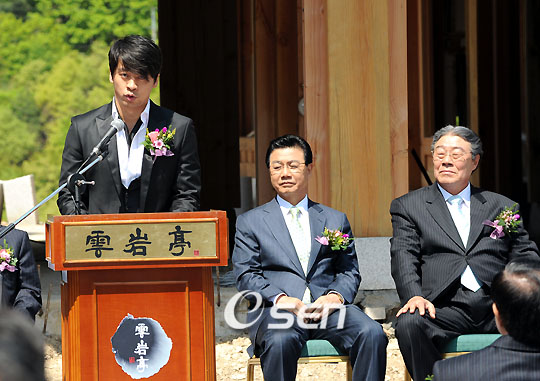 6월 16일 첫 방송 예정인 SBS TV 새 월화드라마 ‘식객’의 촬영현장 공개 행사가 15일 낮 강원도 정선군 강원랜드 내 운암정 신축공사 현장에서 열렸다. 드라마의 중요 촬영지이자 드라마 촬영 후에는 전문 한식점으로 사용될 ‘운암정’의 상량식을 거행하는 장면이었다. 운암정은 4260평방미터(1288평) 넓이의 부지에 주건물인 운암정을 비롯해 주방동 사무동 숙소동 팔각정 등이 들어서 건평만 1567평방미터(474평)에 이른다. 공사비만 약 40억 원이 들어간다. 이날 행사에는 최불암 권오중 김소연 원기준 김성겸 심양홍 등 주연배우들과 김진선 강원도지사, 강원랜드 임직원 등이 참석했다. 김진선 강원도지사가 카메오로 출연해 연기자들과 나란히 앉아 있다. /정선=강희수 기자 100c@osen.co.kr