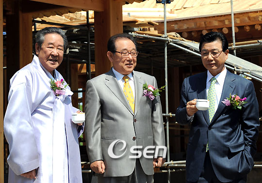 6월 16일 첫 방송 예정인 SBS TV 새 월화드라마 ‘식객’의 촬영현장 공개 행사가 15일 낮 강원도 정선군 강원랜드 내 운암정 신축공사 현장에서 열렸다. 드라마의 중요 촬영지이자 드라마 촬영 후에는 전문 한식점으로 사용될 ‘운암정’의 상량식을 거행하는 장면이었다. 운암정은 4260평방미터(1288평) 넓이의 부지에 주건물인 운암정을 비롯해 주방동 사무동 숙소동 팔각정 등이 들어서 건평만 1567평방미터(474평)에 이른다. 공사비만 약 40억 원이 들어간다. 이날 행사에는 최불암 권오중 김소연 원기준 김성겸 심양홍 등 주연배우들과 김진선 강원도지사, 강원랜드 임직원 등이 참석했다. 김진선 강원도지사(맨 오른쪽)가 쉬는 시간을 이용해 최불암 심양홍과 차를 마시고 있다. /정선=강희수 기자 100c@osen.co.kr