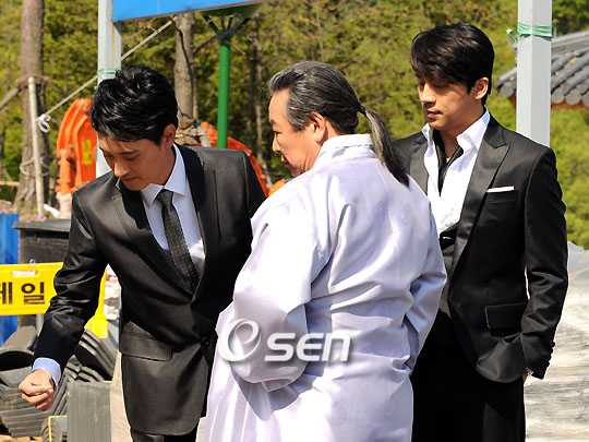 6월 16일 첫 방송 예정인 SBS TV 새 월화드라마 ‘식객’의 촬영현장 공개 행사가 15일 낮 강원도 정선군 강원랜드 내 운암정 신축공사 현장에서 열렸다. 드라마의 중요 촬영지이자 드라마 촬영 후에는 전문 한식점으로 사용될 ‘운암정’의 상량식을 거행하는 장면이었다. 운암정은 4260평방미터(1288평) 넓이의 부지에 주건물인 운암정을 비롯해 주방동 사무동 숙소동 팔각정 등이 들어서 건평만 1567평방미터(474평)에 이른다. 공사비만 약 40억 원이 들어간다. 이날 행사에는 최불암 권오중 김소연 원기준 김성겸 심양홍 등 주연배우들과 김진선 강원도지사, 강원랜드 임직원 등이 참석했다. 말총머리 헤어스타일로 파격 변신한 최불암이 촬영에 앞서 원기준 권오중과 함께 이야기를 나누고 있다. /정선=강희수 기자 100c@osen.co.kr