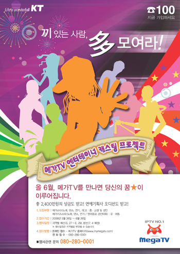 KT 메가TV가 뉴미디어 시대를 이끌어갈 예비스타를 선발한다. 국내 유명 연예 기획사들과 함께 미래 미디어를 이끌어갈 예비 스타 캐스팅을 시작하는 것. KT 메가TV(대표이사 남중수)는 싸이더스FnH, 올리브9 등 9개 기업들과 함께 IPTV 시대의 새로운 미디어를 이끌어 나갈 재능 있는 엔터테이너 발굴을 위해 ‘메가TV 엔터테이너 캐스팅’ 프로젝트를 시작한다고 21일 밝혔다. ‘메가TV 엔터테이너 캐스팅’은 노래, 연기, 댄스, 개그 등의 분야에서 뛰어난 새 얼굴을 찾아 IPTV 미디어 엔터테이너로 육성하기 위해 기획됐다. 중고생, 성인 대상의 ‘메가스타’와 유,아동 대상의 ‘메가 키즈스타’로 나뉘어 진행된다. 이번 행사는 최지우 신현준이 소속돼 있는 ‘올리브 9’, 손호영 장근석이 있는 ‘루브엔터테인먼트’, ‘스타케이’ ‘트엔터테인먼트’ 등이 심사과정에서 대거 참여한다. 예선, 본선 과정에서 특별한 ‘끼’를 보여주는 참가자는 각 분야의 전문 심사위원에 의해 현장 캐스팅의 기회도 얻을 수 있다. 결선 대회 참가자 중 1등이 가수일 경우 디지털 싱글 앨범 발매의 기회도 주어져 엔터테이너로 활동을 시작할 수 있다. 지역별 예선 경합을 통해 각 분야별 1등에게는 상금 50만 원과 본선 진출권이, 2등과 3등에게는 각각 30만 원과 20만 원 상당의 상품과 부상이 주어진다. 본선에서는 부문별 각 1등 500만 원, 2등 300만 원, 3등 100만 원의 상금과 상패가 증정된다. ‘메가TV 엔터테이너 캐스팅’은 오는 26일부터 6월 25일까지 참가자를 모집하고, 6월 27일부터 3일간 지역별 예선 후 7월 초 본선을 진행할 계획이다. 참가접수는 인터넷 온라인(http://www. mymegatv.com)과 전화(080-280-0001)로 가능하다. 100c@osen.co.kr