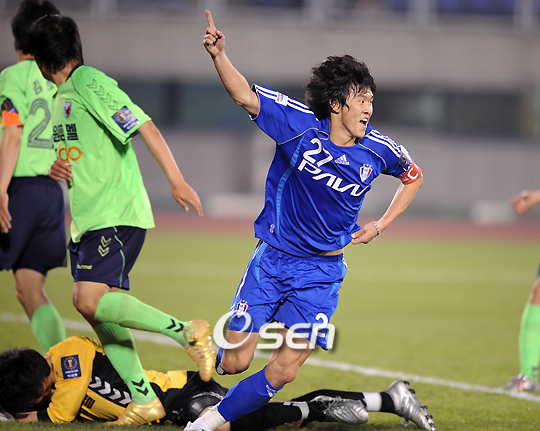 '2008 하나은행 FA컵 전국 축구선수권대회' 32강 수원 삼성과 노원 험멜코리아의 경기가 21일 부천종합운동장에서 벌어져 전 후반 0-0 승부를 가르지 못해 승부차기 까지 가는 고전 끝에 수원이 승부차기 4-2 승리를 거두고 16강에 진출했다. 경기 종료 직전 수원 서동현의 골이 골키퍼 차징으로 노 골 선언됐다. 골로 착각한 서동현이 환호하고 있다. /부천=황세준 기자 storkjoon@osen.co.kr
