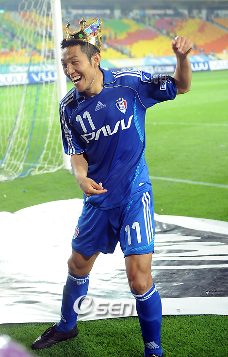 '삼성 하우젠K-리그 2008' 수원 삼성과 포항 스틸러스의 경기가 24일 수원 월드컵경기장에서 벌어졌다. 후반 25분 에두의 결승골로 수원이 1-0으로 승리했다. 6월 25일까지 휴식기에 들어가는 관계로 경기 후 수원 김대의 생일(5월 30일) 축하 파티를 앞당겨 지난 250경기 출전기념 축하를 겸해 치러졌다. 김대의가 팬들을 위해 코믹댄스를 선보이고 있다./수원=민경훈 기자 rumi@osen.co.kr