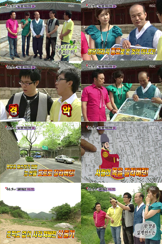 MBC TV ‘일요일 일요일 밤에(이하 ‘일밤’)’ ‘고수가 왔다’가 계속되는 ‘명당’편 방송과 더불어 2006년 방송된 ‘느낌표-위대한 유산 74434’와 흡사한 소재를 방송해 벌써부터 방송 소재가 고갈된 게 아니냐는 빈축을 사고 있다. 25일 방송된 ‘고수가 왔다’ 편에서는 학생들의 학습 능률을 올려준다는 명당 터에 위치한 명당학교가 소개된 뒤 대부분의 방송 시간이 일제에 의해 훼손당한 명당에 대한 이야기로 채워졌다. 먼저 서울에 위치한 종묘와 창경궁 사이에 난 율곡로를 찾아가 그 길은 일제 강점기 당시 궁궐과 종묘의 맥을 끊기 위해 계획적으로 만들어진 길임을 밝혔다. 명당의 고수는 지도 속의 조감 형태가 사람이 앉아 있는 모양과 흡사한데, 일본이 사람의 목에 해당하는 창경궁와 종묘 사이를 끊어버린 것이라고 말하자 MC들은 입을 모아 분개했다. 또 충남 예산에 위치한 조선 26대 임금 고종의 할아버지인 남연군의 묘는 상황이 더욱 참혹했다. 원래 남연군의 묘는 묘 뒤로 가야산이 둘러싸여 천연의 명당터였지만, 일본은 이 명당의 산능선을 깊이 파내버려 산줄기가 흔적도 없이 사라진 것. MC들은 눈 앞에서 벌어진 만행을 항의도 하지 못한 채 지켜봐야만 했던 선조들의 마음을 돌이키며 안타까움을 금치 못했다. 하지만 25일 방송된 내용은 ‘고수가 왔다’ 보다는 2006년부터 방송된 MBC TV ‘느낌표-위대한 유산 74434’에서나 나올법한 내용이 아니냐는 지적이다. 또 지금까지 ‘고수가 왔다’에서 방송된 ‘기획 부동산’ ‘재건축’ ‘내 집 마련하기’ ‘명당아파트’ ‘명당학교’와는 전혀 다른 내용으로 벌써부터 ‘고수가 왔다’의 소재가 다 떨어진 것이 아니냐는 지적도 일고 있다. 또 다음주 6월 1일 방송 예고에서는 이사한 지 얼마 되지 않아 암에 걸리고, 기가 세다는 무당 조차 살지 못하는 흉당을 찾아가 흉당을 명당으로 바꾸는 비법 등이 소개돼 같은 소재를 여러 번 반복해 우려먹는다는 비판도 일고 있다. 애초 김용만-김제동-이혁재-강수전 등 간판급 MC들을 동원해 대한민국 초미의 관심사인 부동산, 내 집 마련, 자녀 교육, 취업, 범죄 등 생활에 필요한 아이템을 통해 각 분야의 고수를 찾아 노하우를 배워보겠다던 ‘고수가 왔다’의 기획의도가 무색해 지는 가운데, ‘고수가 왔다’가 정보와 오락이 가미된 고품격 알짜 생활 버라이어티로 ‘일밤’에서 살아 남을 수 있을지 관심이 모아지고 있다. ricky337@osen.co.kr MBC '고수가 왔다' 방송 장면 캡처.
