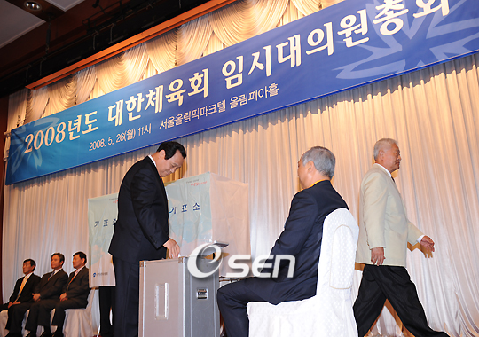 이연택 전 회장이 26일 서울 송파구 방이동 올림픽파크텔에서 열린'2008년도 대한체육회 임시 대의원총회'에서 새 정부 들어 사퇴한 김정길 전 회장의 잔여 임기를 채우기 위한 신임 회장 선거 결과 결선 투표까지 간 끝에 총 53표 중 33표를 획득해 대한체육회 회장에 당선됐다. 대의원들이 투표함에 투표 용지를 넣고 있다. /황세준 기자 storkjoon@osen.co.kr