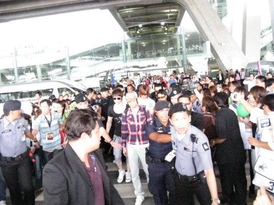 그룹 SS501이 태국 방콕을 뜨겁게 달궜다. 프로모션을 위해 30일 태국을 처음으로 방문한 SS501은 방콕 스완나품 국제 공항에서부터 500여 팬들의 뜨거운 환호를 받았다. 팬들은 승합차와 승용차 등을 타고 SS501을 쫓아 오는 등 적극적인 움직임을 보였다. 이날 SS501은 태국 신문사 'Thairath Newspaper'의 단독 인터뷰로 방콕 방문 첫날 일정을 시작했다. 또 20여개의 태국 주요 매체가 참가한 가운데 공식 기자회견을 가졌다. 기자회견에서 김형준은 "작년에 비공식적으로 태국에 한번 왔었는데 그 때도 반응이 뜨거워 놀랐다. 그런데 이번에도 공항에서부터 팬들이 나와줘 너무 감사했다. 빨리 태국에서 단독공연을 하고 싶다"는 소감을 전했다. "태국에서 가장 기억에 남는 것은 무엇이냐"는 질문에 박정민은 "사람들의 따뜻한 미소", 김형준은 "편안하고 가족같은 분위기", 김현중은 "몸을 풀어주는 마사지"라고 대답했다. 이어 태국의 인기 팝 라디오 채널 '버진 힛츠 라디오(Virgin Hitz Radio)'에 생방송으로 출연하기도 했다. SS501은 6월 2일까지 방콕에서 공식 스케줄을 갖는다. 방콕에 머무르는 동안 팬미팅, 쇼케이스, 20여개 매체와의 인터뷰 등 빡빡한 스케줄을 소화하게 된다. SS501은 "다른 한국 가수들에 비해 조금 늦게 태국에 오게 돼 조금 아쉽지만 지금부터 열심히 하면 태국에서도 큰 사랑을 받을 수 있을 것이라 생각한다"며 "이번 기회에 태국 팬들에게 우리를 확실히 각인시킬 수 있도록 모든 노력을 다하겠다"고 각오를 다졌다. hellow0827@osen.co.kr