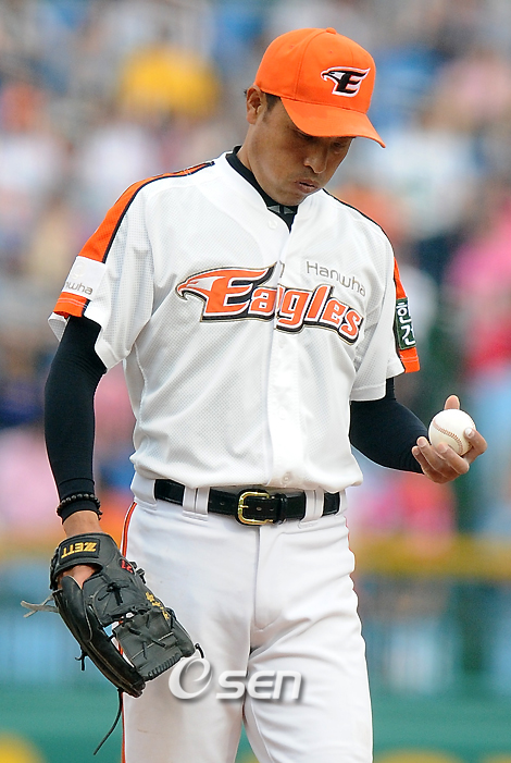'2008 삼성 PAVV 프로야구' 한화 이글스와 우리 히어로즈 경기가 6일 대전구장에서 벌어졌다. 프로통산 첫 2000탈 삼진의 대기록을 3개 남긴 송진우가 8회초 우리 송지만을 삼진 처리하며 프로야구 탈삼진 부문의 금자탑을 세웠다. 5회초 무사 주자 1루 송진우가 투스트라이크를 잡아낸 상태에서 볼을 바라보고 있다./대전=민경훈 기자rumi@osen.co.kr