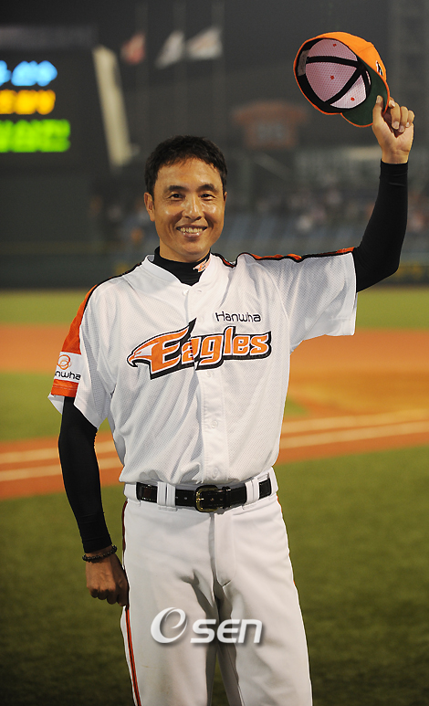 '2008 삼성 PAVV 프로야구' 한화 이글스와 우리 히어로즈 경기가 6일 대전구장에서 벌어졌다. 프로통산 첫 2000탈 삼진의 대기록을 3개 남긴 송진우가 8회초 우리 송지만을 삼진 처리하며 프로야구 탈삼진 부문의 금자탑을 세웠다. 또한 이 날 경기에서 연장 12회까지가는 접전 끝에 승리를 거둬 기쁨이 배가 됐다. 송진우가 팬들에게 인사를 하고 있다./대전=민경훈 기자rumi@osen.co.kr
