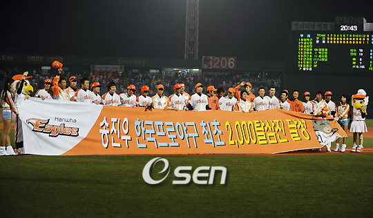 '2008 삼성 PAVV 프로야구' 한화 이글스와 우리 히어로즈 경기가 6일 대전구장에서 벌어졌다. 프로통산 첫 2000탈 삼진의 대기록을 3개 남긴 송진우가 8회초 우리 송지만을 삼진 처리하며 프로야구 탈삼진 부문의 금자탑을 세웠다. 또한 이 날 경기에서 연장 12회까지가는 접전 끝에 한화가 우리를 1대0으로 꺾고 승리하였다. 송진우의 2000탈 삼진을 기념하는 행사가 열리고 있다./대전=민경훈 기자rumi@osen.co.kr