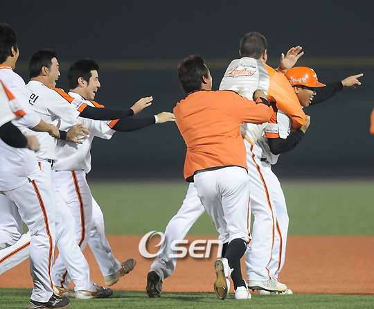 '2008 삼성 PAVV 프로야구' 한화 이글스와 우리 히어로즈 경기가 6일 대전구장에서 벌어졌다. 프로통산 첫 2000탈 삼진의 대기록을 3개 남긴 송진우가 8회초 우리 송지만을 삼진 처리하며 프로야구 탈삼진 부문의 금자탑을 세웠다. 또한 이 날 경기에서 연장 12회까지가는 접전 끝에 한화가 우리를 1대0으로 꺾고 승리했다. 연장 12회 말 2사 주자 만루 한화 이희근이 끝내기 데드볼을 얻어내고 동료들과 기쁨을 나누고 있다./대전=민경훈 기자rumi@osen.co.kr