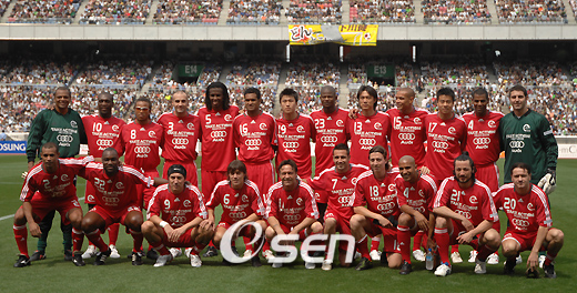 일본의 축구 스타 나카타가 주최한 일본 올스타 팀과 세계 올스타 팀이 출전하는 ‘+1 FOOTBALL MATCH’ 자선 경기가 7일 오후 요코하마에서 닛산 스타디움에서 벌어졌다. 한국에서는 홍명보 올림픽대표팀 코치와 이호(제니트)가 세계올스타팀으로 참가했고 톱스타 배용준이 나카타의 초청을 받아 특별 게스트로 경기를 관전했다. 세계 올스타팀으로 출전한 선수들이 기념사진을 찍고 있다./요코하마=송석린 객원기자 song@osen.co.kr