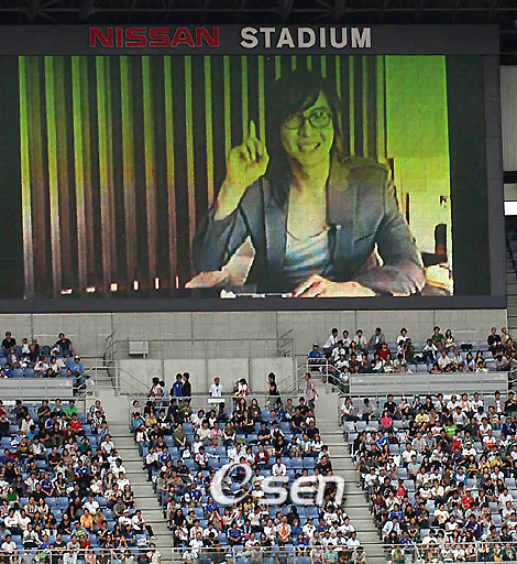일본의 축구 스타 나카타가 주최한 일본 올스타 팀과 세계 올스타 팀이 출전하는 ‘+1 FOOTBALL MATCH’ 자선 경기가 7일 오후 요코하마에서 닛산 스타디움에서 벌어졌다. 한국에서는 홍명보 올림픽대표팀 코치와 이호(제니트)가 세계 올스타 팀으로 참가했고 톱스타 배용준이 나카타의 초청을 받아 특별 게스트로 경기를 관전했다. 경기를 관전하는 배용준의 모습이 전광판에 나오고 있다./요코하마=송석린 객원기자 song@osen.co.kr