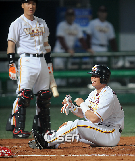 '2008 삼성 PAVV 프로야구' 우리 히어로즈와 KIA 타이거즈의 경기가 10일 목동구장에서 벌어졌다. 6회말 2사 주자 1,3루 대타 강병식이 2루타로 3루주자 브룸바가 먼저 홈인을 하여 1득점하고 1루주자 송지만이 홈으로 달렸지만 KIA 차일목 포수에게 태그아웃 되었다. 송지만이 홈에서 아웃된 후 허탈하게 웃고 있고 김동수가 이를 애처롭게 바라보고 있다./목동=민경훈 기자 rumi@osen.co.kr