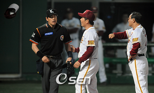 '2008 삼성 PAVV 프로야구' 우리 히어로즈와 KIA 타이거즈와경기가 10일 목동구장에서 벌어졌다.7회초 2사 만루 KIA 김원섭 타석때 강광회 구심이 우리 송신영 투수의 연속 3개 투구를 볼로 판정하자 우리 이광환 감독이 강하게 항의하다가 퇴장처리를 당했다. 이에 이광환 감독이 화가나서 모자를 집어던지고 있다./목동=민경훈 기자 rumi@osen.co.kr