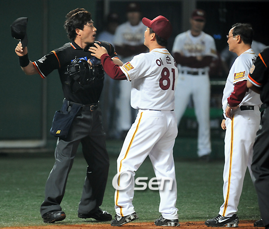'2008 삼성 PAVV 프로야구' 우리 히어로즈와 KIA 타이거즈와경기가 10일 목동구장에서 벌어졌다.7회초 KIA 2사 만루 상황에서 KIA 김원섭 타석에서 강광회 구심이 볼 3개를 연거푸 판정하여 이에 우리 이광환 감독이 강하게 항의하다가 퇴장처리를 당했다. 이에 이광환 감독이 화가나서 모자를 집어던지며 항의를 했고 강광회 심판도 화가나서 모자를 벗고 있다./목동=민경훈 기자 rumi@osen.co.kr