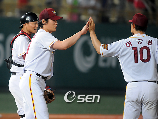 '2008 삼성 PAVV 프로야구' 우리 히어로즈와 KIA 타이거즈의 경기가 10일 목동구장에서 벌어졌다. 이 날 경기에서 우리는 2회말 송지만의 역전투런홈런과 8회말 7타점을 몰아치며 KIA를 10대 2로 꺾고 크게 승리했다. 경기를 마치고 세이브투수가 된 우리 황두성과이 이숭용과 기쁨을 나누고 있다./목동=민경훈 기자 rumi@osen.co.kr