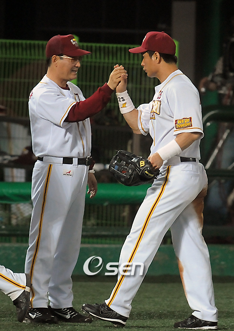 '2008 삼성 PAVV 프로야구' 우리 히어로즈와 KIA 타이거즈의 경기가 10일 목동구장에서 벌어졌다. 이 날 경기에서 우리는 2회말 송지만의 역전투런홈런과 8회말 7타점을 몰아치며 KIA를 10대 2로 꺾고 크게 승리했다. 경기를 마치고 이날 퇴장을 당했던 우리 이광환 감독과 2회말 역전투런홈런을 친 송지만이 하이파이브를 하고 있다./목동=민경훈 기자 rumi@osen.co.kr