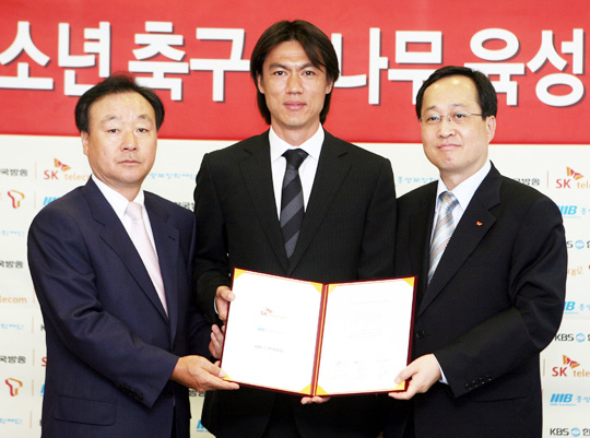 SK텔레콤이 유소년 축구의 후원자로 나섰다. 홍명보장학재단은 11일 서울 을지로 SK텔레콤 본사에서 열린 SK텔레콤과 한국 축구 꿈나무 육성을 위한 기금 후원 조인식을 가졌다. 이날 조인식에는 김신배 SK텔레콤 대표이사와 홍명보 이사장이 참석한 가운데 잠재력 있는 축구 유망주 지원에 3년간 5억 원의 기금을 후원하기로 약속했다. SK텔레콤은 2006년 월드컵 당시 붉은 응원 리본 캠페인을 진행하면서 접수된 응원 메시지가 500만 건을 돌파하면 메시지 한 개 당 100원씩 최대 5억 원의 유소년 축구 발전기금을 후원하겠다고 약속한 바 있다. 당시 응원 메시지는 총 512만 건을 기록했고 SK텔레콤은 약속이행을 위해 다양한 방안을 모색하던 중 홍명보장학재단과 손을 잡고 이번 후원행사를 기획하게 됐다. 후원 기금 5억 원은 SK텔레콤과 홍명보장학재단이 직접 선발한 유소년 축구선수의 해외 유학 프로그램에 사용될 예정이며, 선발된 학생은 브라질 인터나시오날의 유소년 아카데미에서 훈련을 받게 된다. 현재 초, 중, 고교 축구부 또는 클럽 축구부에 소속된 학생은 누구나 지원할 수 있으며 서류 접수는 홍명보장학재단 홈페이지(www.hmb20.com)를 통해 13일부터 30일까지 진행된다. SK텔레콤과 홍명보장학재단은 서류 심사를 통해 20명을 선발한 후 7월 중 실기 테스트 및 면접을 통해 최종 합격자를 선발해 매년 3명씩 3년 간 총 9명에게 브라질 유학을 지원한다는 계획이다. 홍명보는 "이번 기회를 통해 축구 꿈나무들이 보다 전문적인 축구 훈련을 받을 수 있게 되어 기쁘다"며 "앞으로 한국 축구의 미래를 이끌어갈 태극전사들이 배출되기를 바란다"고 희망 섞인 바람을 밝혔다. stylelomo@osen.co.kr 홍명보장학재단 제공.