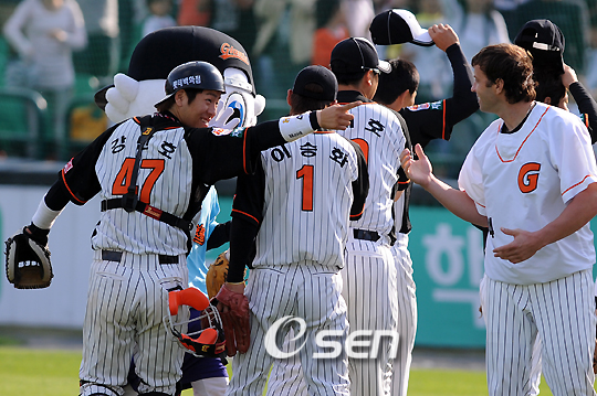 '2008 삼성 PAVV 프로야구' 롯데 자이언츠와 우리 히어로즈 경기가 15일 부산 사직구장에서 벌어졌다. 롯데가 2-3으로 뒤지던 8회말 무사 1,3루서 강민호의 우중간 2루타 때 3루주자 조성환에 이어 1루주자 이대호도 중견수 실책으로 홈인, 역전에 성공한 뒤 6-3으로 이겼다. 경기 후 강민호가 7이닝 2실점으로 호투하고도 패전투수가 될 뻔했던 선발 매클레리를 가리키며 웃고 있다. /부산=윤민호 기자 ymh@osen.co.kr