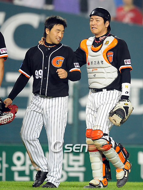 '2008 삼성 PAVV 프로야구' LG 트윈스와 롯데 자이언츠 경기가 20일 잠실구장에서 벌어졌다. 연장 까지 가는 접전 끝에 강민호의 4회초 솔로 홈런과 10회 초 투런홈런에 힘입어 롯데가 LG를 4:1로 꺾고 승리했다. 경기를 마치고 이 날 솔로홈런과 투런홈런을 친 포수 강민호와 손광민이 얘기를 나누며 덕아웃으로 들어서고 있다./잠실=민경훈 기자 rumi@osen.co.kr