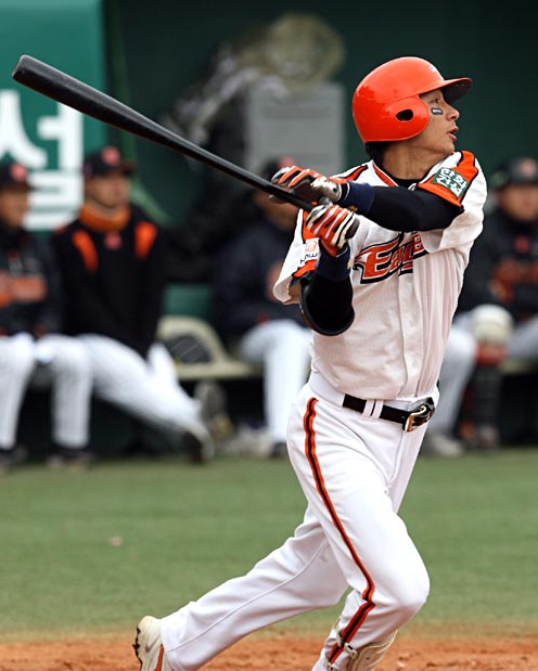 [OSEN=이상학 객원기자] “아무래도 1번은 부담이 되죠.” 올 시즌 한화의 톱타자는 베테랑 이영우였다. 이영우는 45경기에 1번 톱타자로 선발출장하며 공격첨병 노릇을 톡톡히 해줬다. 하지만 이영우는 “나는 예나 지금이나 전형적인 톱타자는 아니다. 발 빠른 선수들이 1번을 쳐야 한다”며 올 시즌 한화의 보물로 자리매김한 추승우(29)를 추천했다. 평소 이영우는 추승우에게 1번을 쳐야 한다고 강조하고 있다. 추승우는 KIA와의 청주 3연전 첫 2경기에서 연속해 1번 톱타자로 선발출장하며 빠르게 적응 중이다. 지난해 LG에서 방출된 뒤 김인식 감독의 부름을 받아 한화 유니폼을 입은 추승우는 올 시즌 명실상부한 최고의 반전스타로 떠올랐다. 지난해까지 철저한 무명이었지만 한화 이적 첫 해인 올해는 아예 붙박이 주전 자리를 꿰찼다. 올 시즌 66경기에서 191타수 57안타로 타율 2할9푼8리·15타점·33득점·11도루를 마크하며 펄펄 날고 있다. 추승우를 데려오며 재활공장장 명성을 재확인한 김인식 감독은 “알게 모르게 승부에 미치는 영향이 큰 녀석”이라며 추승우를 대견스럽게 바라보고 있다. 김 감독은 최근 추승우를 1번으로 기용하는 또 하나의 실험을 하고 있다. 이영우가 다소 타격침체를 보인 것도 한 이유이지만 발빠르고 상대를 뒤흔들 수 있는 선수를 1번으로 기용하는 전통적인 방법에 근거해 추승우를 기용하고 있다. 시즌 초반 1번 톱타자로 기용된 후 추승우는 잠시 백업으로 있다 라인업에 복귀할 때 타순이 2번이었다. 2번 타순에서 추승우는 부담없이 맹타를 휘둘렀다. 올 시즌 추승우는 2번 타순으로 출장한 31경기에서 타율 3할2푼8리를 기록, 테이블세터 역할을 훌륭하게 소화했다. 한화의 오래된 고민을 털어내는 활약이었다. 반면 1번 타자로 나온 14경기에서는 타율 2할2푼으로 부진한 편. 하지만 최근 2경기에서 추승우는 리드오프 역할을 다해내고 있다. 24일 KIA전에서 5타수 3안타로 불방망이를 휘둘렀고, 25일 경기에서도 첫 타석에서 3루타를 터뜨리는 등 5타수 1안타 1볼넷을 기록했다. 추승우는 “아무래도 1번 타순은 부담이 된다. 아직까지는 자주 쳤던 2번 타순이 편하다”면서도 “(이)영우 형께서 평소에도 내가 1번을 쳐야 한다고 자주 말씀하신다. 부담은 적지 않지만 톱타자로도 빨리 적응할 수 있도록 노력할 것이다. 타격감이 나쁘지 않아 괜찮다”며 자신감도 슬며시 드러냈다. 추승우는 적응력이 매우 뛰어난 선수로 평가된다. 올 시즌 한화로 이적하기 전까지 한 번도 외야수비를 경험한 적이 없지만 빠른 발과 다이빙캐치를 앞세운 외야수비로 좌익수·우익수를 넘나드는 수준급 수비수로 재탄생했다. 추승우는 “그동안 3루와 2루만 맡아 외야수비 경험이 없었다. 처음에는 부담도 되고 그랬는데 생각보다 빨리 적응했다. 외야가 나한테 맞는 것 같다”고 말했다. 얼마 전에도 추승우는 “한화가 나한테 딱 맞는 팀이다”며 웃었다. 발보다 빠른 적응력으로 한화에 녹아들고 또 외야수로 거듭난 추승우라면 1번 톱타자 적응에도 그리 오랜 시간이 걸리지 않을 듯하다. 한화 이글스 제공. . . . . .