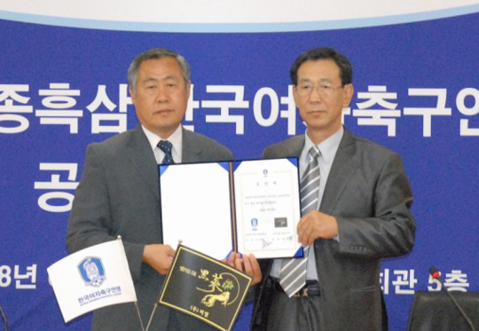 한국 여자축구연맹이 (주)비엘과 협찬 조인식을 체결했다. 한국 여자축구연맹은 26일 오후 3시 서울 신문로 축구회관 5층에서 열린 협찬 조인식을 갖고 비엘로부터 2년간 1억 2000만 원 상당의 흑삼 지원을 약속 받았다. 이날 조인식은 ▲ 한국여자축구연맹 장순필 부회장의 인사 ▲ 비엘의 김항종 대표이사의 인사 ▲ 협찬 조인서 교환으로 진행되었다. 이로써 한국 여자축구연맹은 인삼과 홍삼의 효능을 모두 갖춘 흑삼을 선수들에게 지원하게 되었고, 비엘은 한국 여자축구연맹의 공식 물품후원사로서 권리를 갖게 됐다. 비엘의 김항종 대표이사도 "한국 여자축구에 도움일 될 수 있어 기쁘다. 우리가 제공하는 ‘김항종흑삼’으로 여자축구 선수들의 체력 향상에 큰 도움이 됐으면 좋겠다"고 말했다. 이에 장순필 한국 여자축구연맹 부회장은 "여자축구에 믿음을 가지고 도와주시는 분들이 조금씩 늘고 있다는 것을 뜻 깊게 생각한다"며 "비엘과의 상생관계를 지속적으로 유지하고자 한다. 오늘의 도움에 힘입어 여자축구의 발전을 위해 노력하겠다"고 답했다. stylelomo@osen.co.kr 한국여자축구연맹 제공.