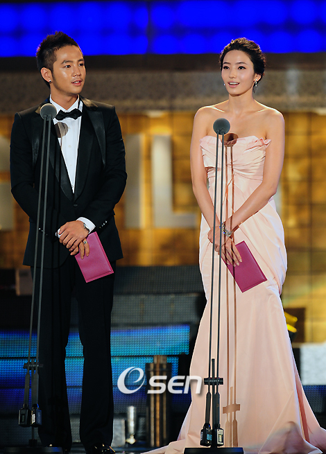 제45회 대종상 영화제 시상식이 27일 저녁 서울시 강남구 삼성동 코엑스 컨벤션홀에서 열렸다. 56개 작품이 출품돼 최우수 작품상, 감독상, 남녀 주연상 등 20여개 부문에서 트로피 주인공을 가린다. 그 중 영화 '추격자'는 최다인 11개 부문에 노미네이트 돼 몇 개나 수상을 할 지 관심이 쏠려 있다. 편집상과 영상기술상을 시상하기 위해 무대로 나온 장근석과 한채영이 얘기를 나누고 있다./민경훈 기자 rumi@osen.co.kr