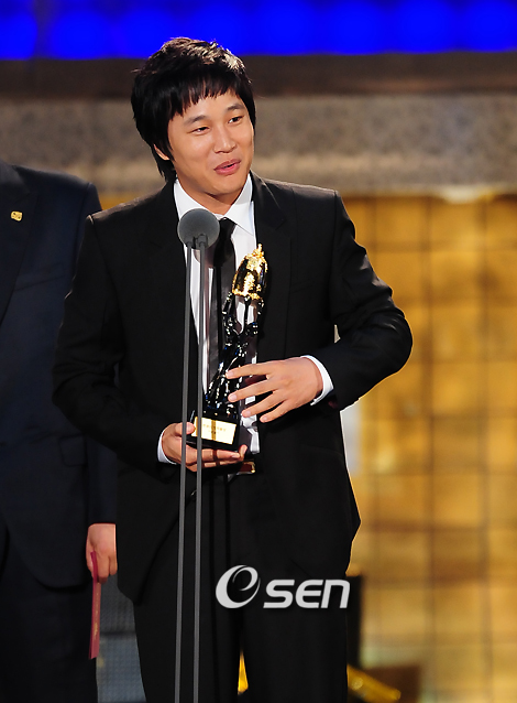 제45회 대종상 영화제 시상식이 27일 저녁 서울시 강남구 삼성동 코엑스 컨벤션홀에서 열렸다. 56개 작품이 출품돼 최우수 작품상, 감독상, 남녀 주연상 등 20여개 부문에서 트로피 주인공을 가린다. 그 중 영화 '추격자'는 최다인 11개 부문에 노미네이트 돼 몇 개나 수상을 할 지 관심이 쏠려 있다. 영화 '바보'가 한류 인기 작품상으로 뽑혀 주연 배우인 차태현이 상을 수상하며 소감을 말하고 있다./민경훈 기자 rumi@osen.co.kr