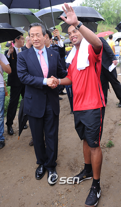 자신의 시그니쳐 축구화 ‘나이키 호나우디뉴 도이스 FG (Nike Ronaldinho Dois FG)’의 제품 출시 일정에 맞춰 7월 2일 한국을 찾은 호나우디뉴와 슈퍼주니어의 강인이 이 날 서울 여의도 한강고수부지에서 3대3 미니 축구 대결을 펼쳤다. 미니게임 전 정몽준 대한축구협회장과 호나우디뉴가 악수를 하며 손을 흔들고 있다./민경훈 기자 rumi@osen.co.kr