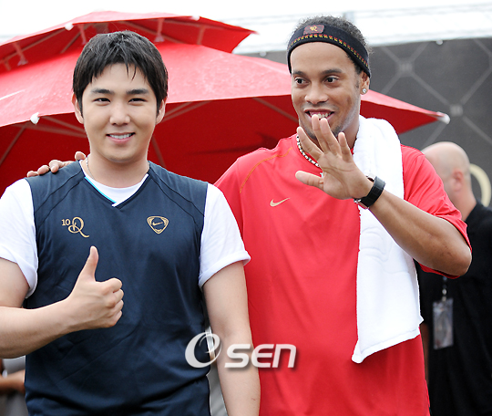 자신의 시그니쳐 축구화 ‘나이키 호나우디뉴 도이스 FG (Nike Ronaldinho Dois FG)’의 제품 출시 일정에 맞춰 7월 2일 한국을 찾은 호나우디뉴와 슈퍼주니어의 강인이 이 날 서울 여의도 한강고수부지에서 3대3 미니 축구 대결을 펼쳤다. 호나우디뉴와 강인이 미니축구게임과 인터뷰를 마치고 포토타임을 갖고 있다./민경훈 기자 rumi@osen.co.kr