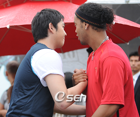 자신의 시그니쳐 축구화 ‘나이키 호나우디뉴 도이스 FG (Nike Ronaldinho Dois FG)’의 제품 출시 일정에 맞춰 7월 2일 한국을 찾은 호나우디뉴와 슈퍼주니어의 강인이 이 날 서울 여의도 한강고수부지에서 3대3 미니 축구 대결을 펼쳤다. 호나우디뉴와 강인이 미니축구게임과 인터뷰를 마치고 서로 손을 맞잡으며 서로 얘기를 나누고 있다./민경훈 기자 rumi@osen.co.kr