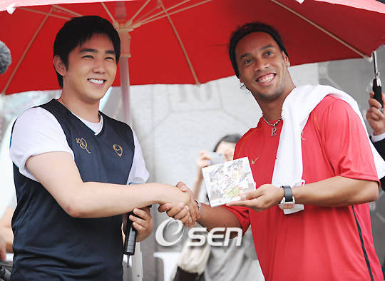 자신의 시그니쳐 축구화 ‘나이키 호나우디뉴 도이스 FG (Nike Ronaldinho Dois FG)’의 제품 출시 일정에 맞춰 7월 2일 한국을 찾은 호나우디뉴와 슈퍼주니어의 강인이 이 날 서울 여의도 한강고수부지에서 3대3 미니 축구 대결을 펼쳤다. 호나우디뉴와 강인이 미니축구게임과 인터뷰를 마친 후 강인이 슈퍼주니어 해피의 사인CD를 주며 악수를 하고 있다./민경훈 기자 rumi@osen.co.kr