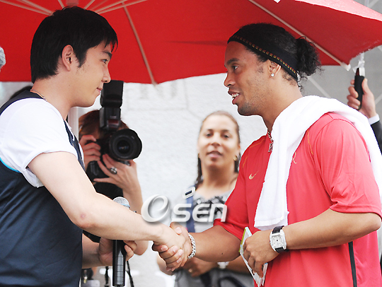 자신의 시그니쳐 축구화 ‘나이키 호나우디뉴 도이스 FG (Nike Ronaldinho Dois FG)’의 제품 출시 일정에 맞춰 7월 2일 한국을 찾은 호나우디뉴와 슈퍼주니어의 강인이 이 날 서울 여의도 한강고수부지에서 3대3 미니 축구 대결을 펼쳤다. 강인이 슈퍼주니어 해피의 사인CD를 호나우디뉴에게 전해준뒤 악수를 나누고 있다./민경훈 기자 rumi@osen.co.kr