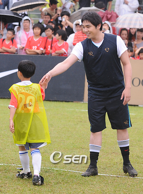 자신의 시그니쳐 축구화 ‘나이키 호나우디뉴 도이스 FG (Nike Ronaldinho Dois FG)’의 제품 출시 일정에 맞춰 7월 2일 한국을 찾은 호나우디뉴와 슈퍼주니어의 강인이 이 날 서울 여의도 한강고수부지에서 3대3 미니 축구 대결을 펼쳤다. 호나우디뉴와 강인의 미니 축구경기에서 강인이 골을 넣은 아이와 하이파이브를 하고 있다./민경훈 기자 rumi@osen.co.kr